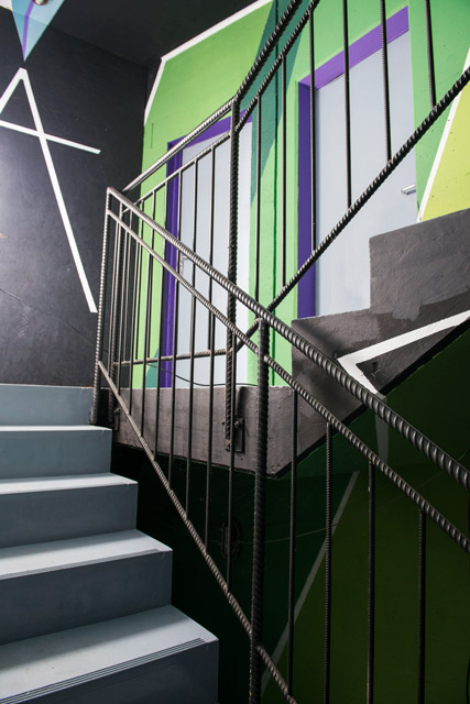 Broken angles give the impression of distorted perspectives and plunge the visitor into a dynamic environment. On each floor, the three abbreviated letters A.F.M – for Association de la Ferme Menthée – appear.