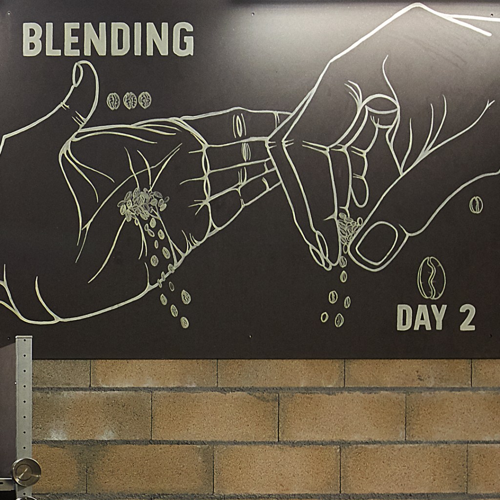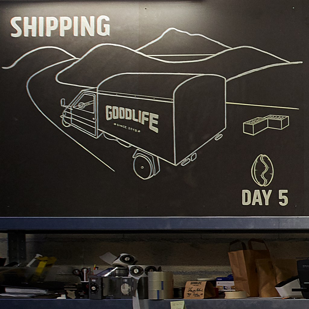 From selected South American and African farms to Swiss cups. In 5 days, the fresh coffee beans go from green to finely roasted, and from raw bags to customized packing and shipping. To align my techniques with this meticulous and artisanal work, I chose to realize this painting only with brushes and white acrylic on blackboards to illustrate the journey and the transformation of these fine-tuned coffee beans.